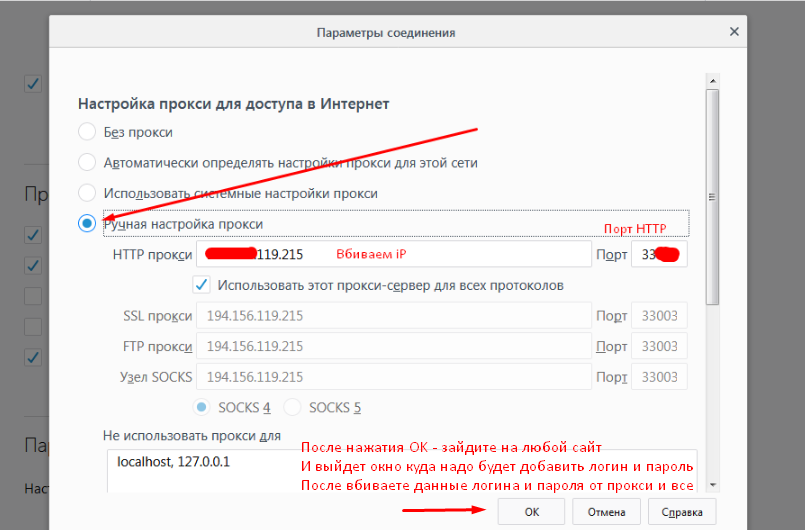 • enter the HTTP proxy address of the purchased proxy server and the port – if you purchased an HTTP proxy server;